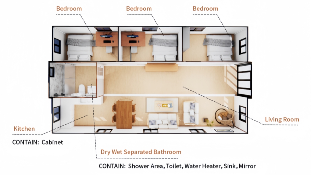 4.Customization is also supported: interior layout, exterior/interior colors, door/window configuration can be tailored to suit branding, site requirements or personal taste.